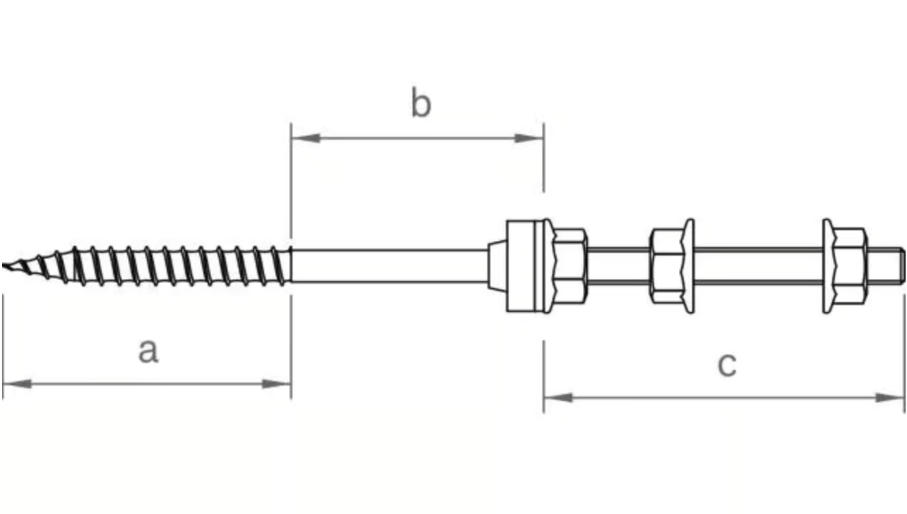 Stock screw for timber purlins with hexagon drive 9 AF, for mounting C-rails, pre-assembled with EPDM seal and 18 AF locking nuts.